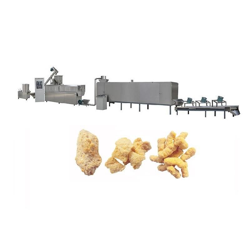 说明:组织蛋白生产线以低温豆粕、花生粕为主要原料,经粉磨、搅拌、调质、高温、高压、高剪切,将球形蛋白质分子打开成链状并重新组织化,形成如肉状纤维结构的如瘦肉状且有咀嚼感的新型食品;