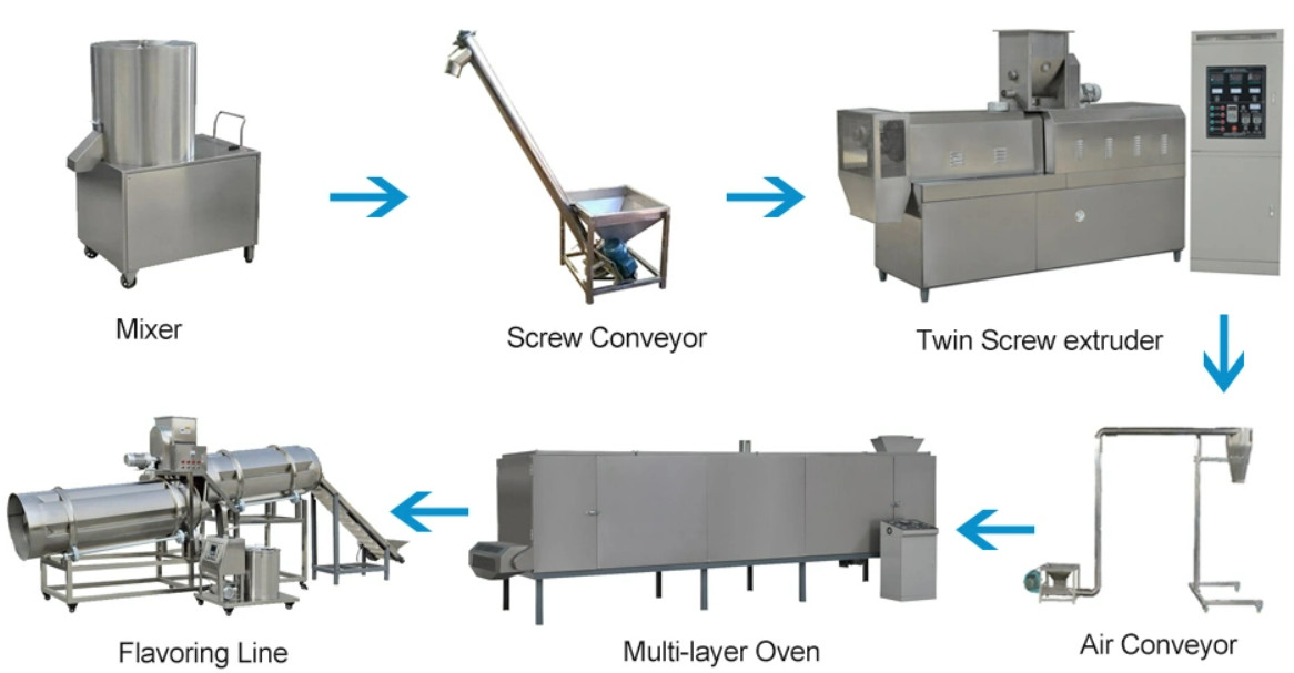 Mixer→screw conveyor→twin screw extruder→air conveyor→dryer→hoister→flavoring drum and oil sprayer→cooling machine→packing machine